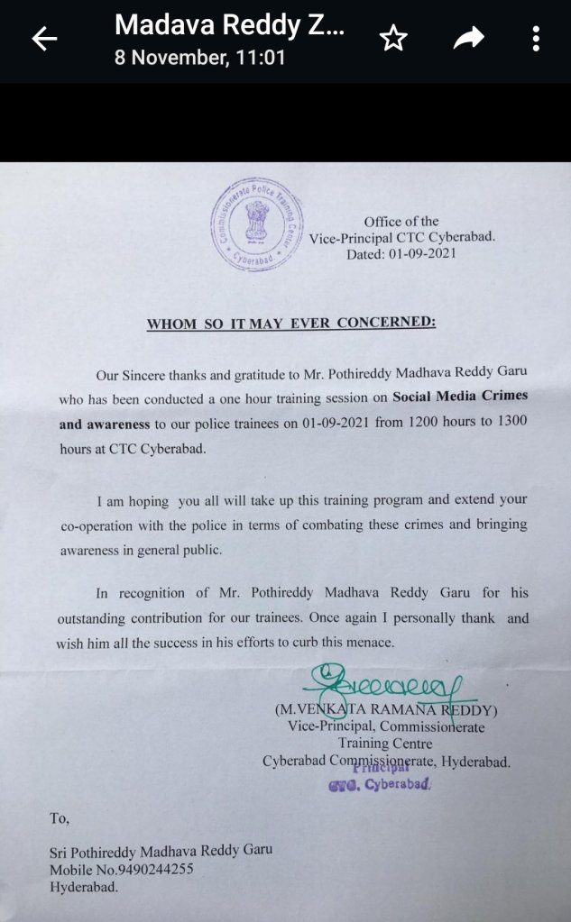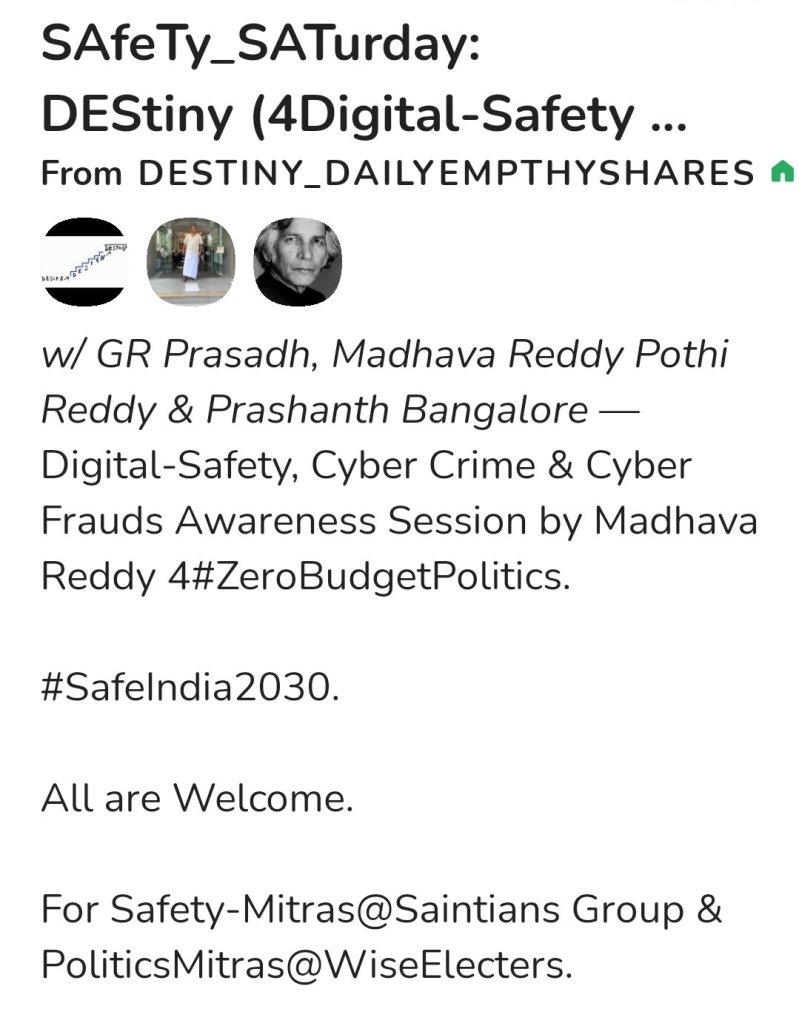 Meet#22 (13/11/21) Sat@7-8pm: SAfeTy-Saturdays @DEStiny Meets: Madava Reddy Garu’s session on Social Media Crime Awareness. For Safety-Mitras, SAINTians & Arogya-Mitras, Academic-Mitras, ScienceMitras, Democratic-Mitras groups etc.. install Clubhouse to attend.