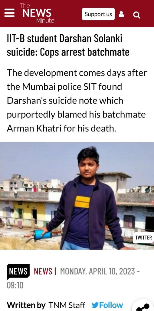 2. 17/1/21 Today’s IIx-Suicide: https://www.indiatvnews.com/news/india/mumbai-depressed-iit-bombay-student-from-madhya-pradesh-jumps-death-from-hostel-2022-01-17-754843
