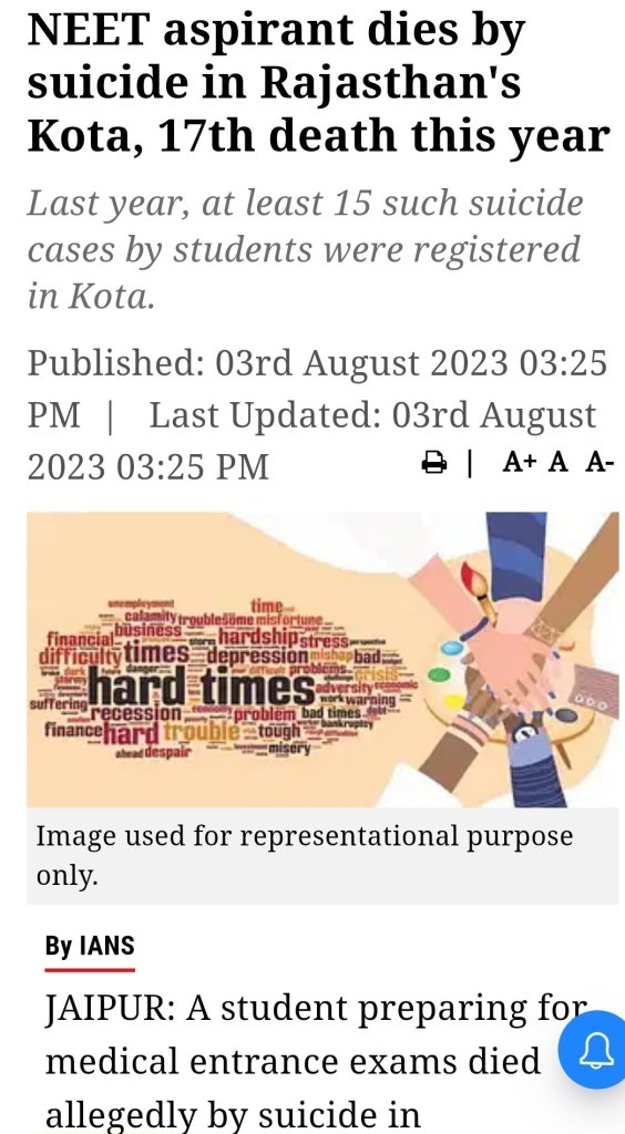 Indian-Educational System is Hurting the Future-India by increasing Suicides-Rates in Academia on Campuses(Higher & also Basic Secondary Education Kota-Suicides) across India.. as in 3 news articles highlighted below. which are from II-X (IIT+IIM+IISc+NIT….+II-X all National Institutes).
