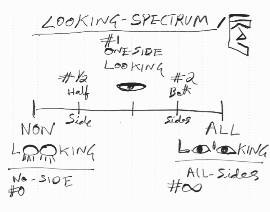 0. The Non-Looking(Non-Lookers): This type of looking is not wanting to look at things. Just stopping from looking out for knowledge, Self or others. Its 99% of the time we are practicing this type of looking that is not look at anything for widening perspectives or wisening visions. This Non-looking attitude is similar to Non-living and non-loving things. The non-Conscious is Non-looking. They perceive less than 1% of the realities.