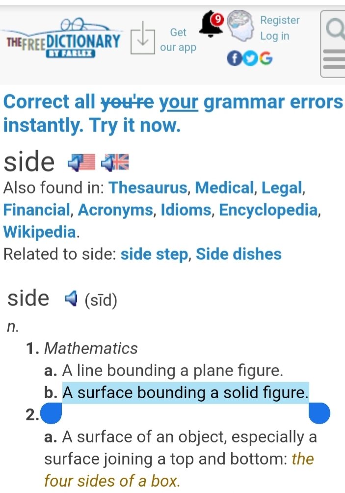 it has minimum 3 Sides.. if counting the edge between the 2 sides too. And even deeper it’s got 5-sides if considering the rounder corner-edges & under a Microscope it has n-number of or Infinite-# of Sides/Surfaces.