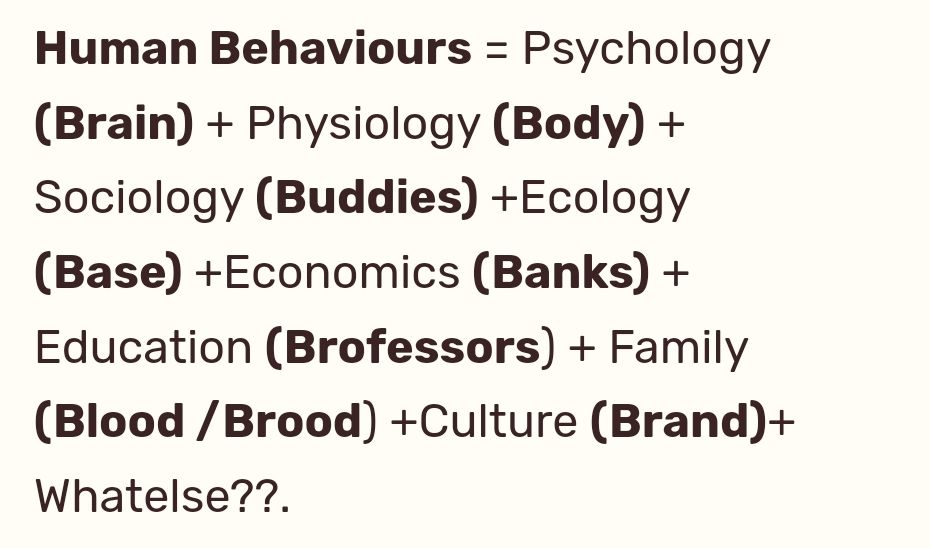 Human Life Behaviours = Psychology (Brain) + Physiology (Body) + Sociology (Buddies/Baddies) +Ecology (Base-Borders) +Economics (Banks) + Foodology (Bread) + Education (Brofessors) + Family (Blood /Brood) + Friends (Brotherhood) +..