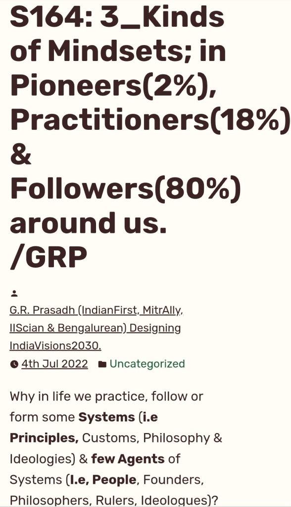 One thought on “S164: 3_Kinds of Mindsets; in Pioneers(2%), Practitioners(18%) & Followers(80%) around us. /GRP”