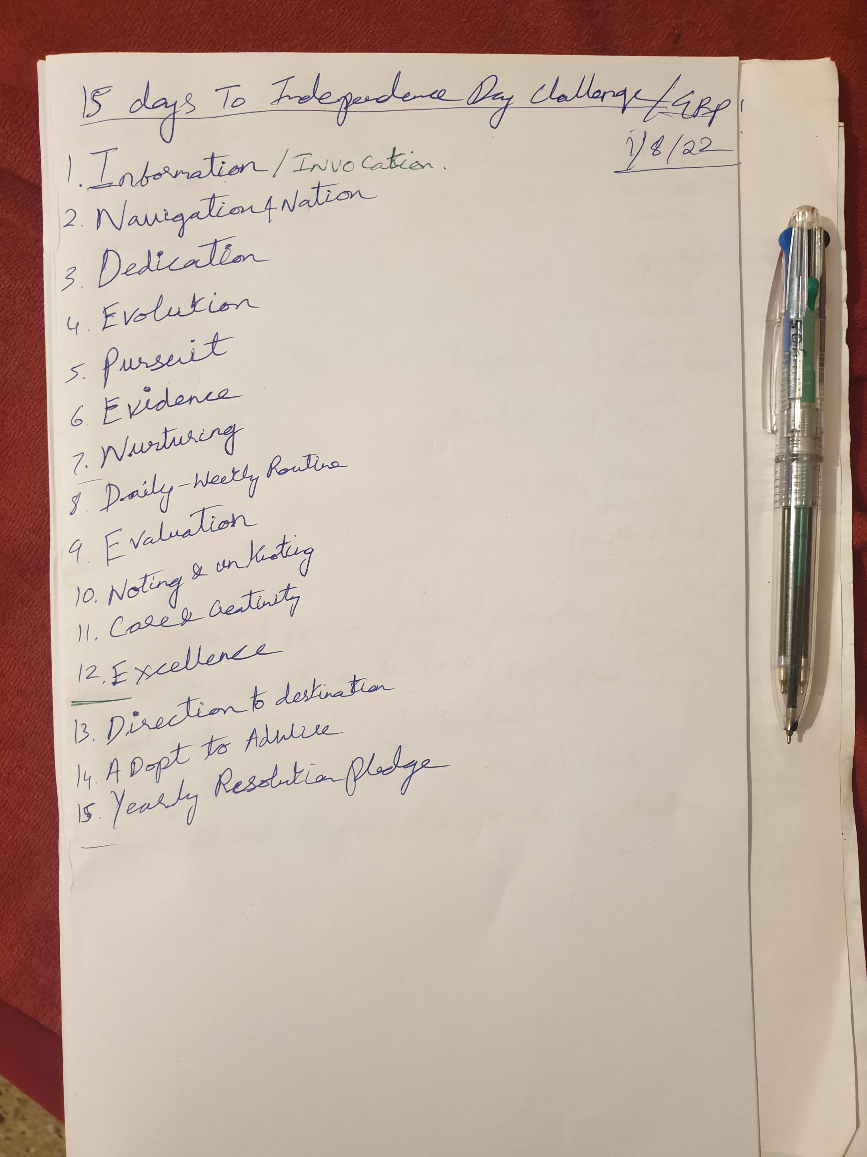 Jai Hind, my Dear Bharath Mitras. This is the plan for 15 lettered Acronym of “INDEPENDENCE-DAY”. Day by Day Journey Log and Milestones to be blogged here.