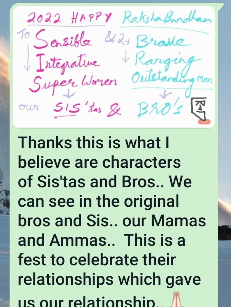I thank a my gud sisters in Life who have been graceful to me as a brother…_ from your GuruBro. https://grpvcare2dare.design.blog/2022/08/12/s183-an-open-letter-to-my-dear-indian-sisters-brothers-on-rakshabandhan-2022-remembering-a-sisters-love/