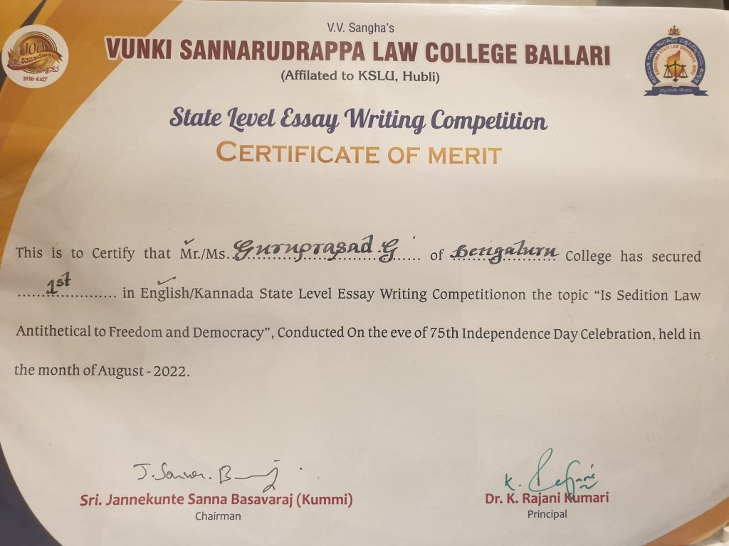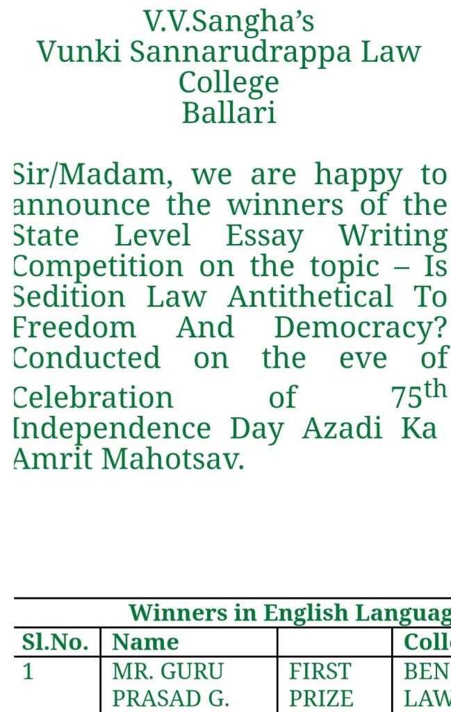 Karnataka State-Level Essay Competition :(Open 2 All KSLU Colleges Conducted By VV Sangha’s Vunki Sannarudrappa College Ballari. Opportunity Courtesy & Credits to: Bengaluru Law College, Bengaluru).