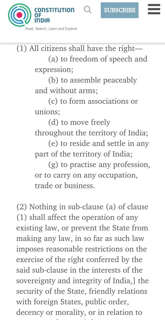 We wrote this essay on sedition laws which had won 1st place in the state level essay competition in 2022, where these related concepts have been expressed. Presenting here to people so people know where the lines are so all are safer.. request to note where article 19(1) have reasonable restrictions in articles 19(2-6).