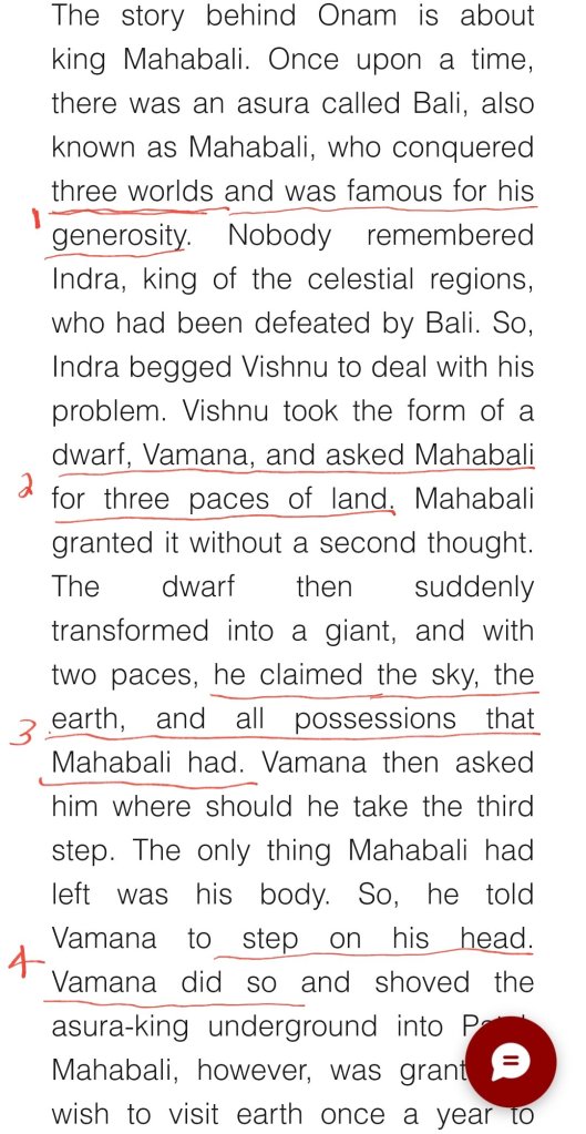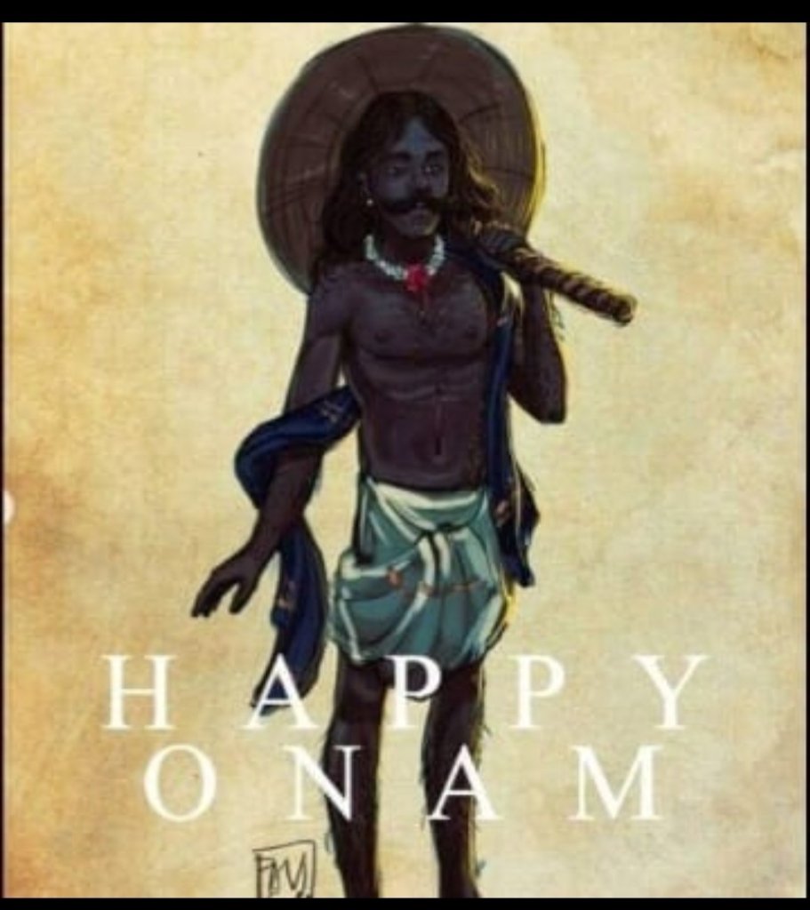 1. The Main Stream Version: https://en.m.wikipedia.org/wiki/Onam : We may observe the pictorisation below of Mahabali king, who is represented with fair skin and few cultural referencing showing Colorism (Fair-Skin and Saffron) and with Vamana’s Fatness, Umbrella & Thread(Covers of Privilege) the king is carrying these are Virtue-Signalling through Symbolisms.