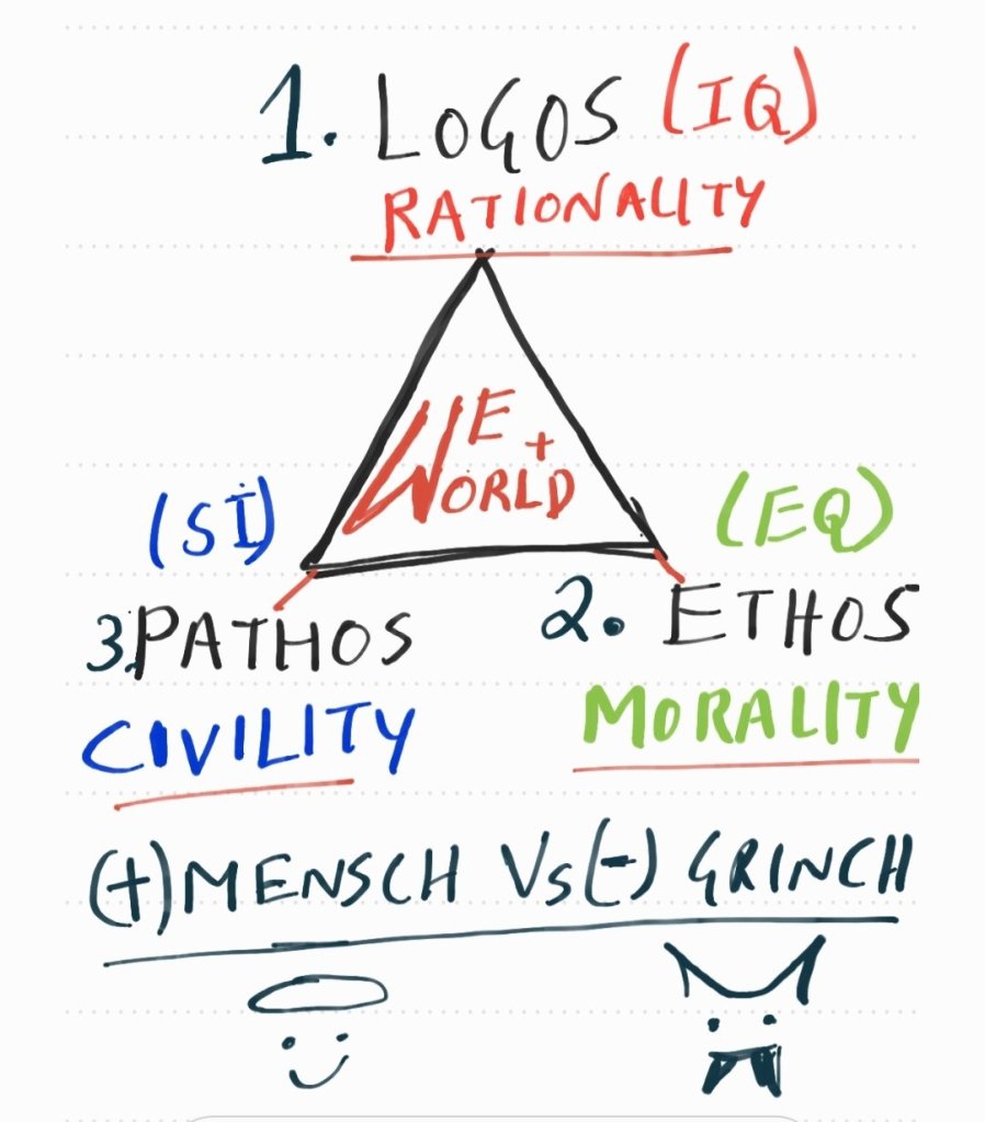 I.e Rationality (IQ; Logical/Cognitive Intelligence) + Morality (EQ; Emotional Intelligence) +Civility (SQ; Social_Intelligence) = Scientific_Temper +Moral_Temper + Social_Temper.