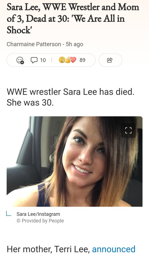 2.B A Gymmer & WWE Wrestler Dies at 30 Years today (7/10/22). Why Red flags not Raised?. Any Explanations to her 3kids? https://www.msn.com/en-us/tv/celebrity/sara-lee-wwe-wrestler-and-mom-of-3-dead-at-30-we-are-all-in-shock/ar-AA12GDvw
