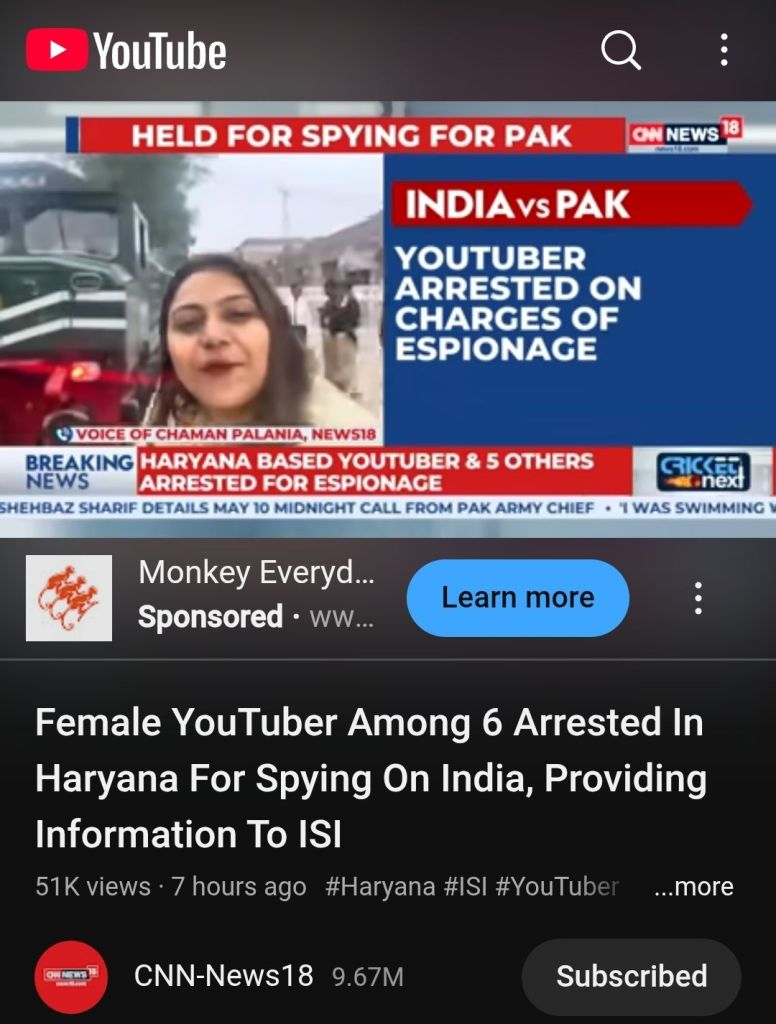 [17/05, 23:16] Guru Prasad. G (Grit, Reach & Purpose= iGRP).: lady spy 4 papistan.. https://www.newsx.com/india/who-is-jyoti-malhotra-haryana-youtuber-arrested-for-spying-after-visit-to-pakistan/