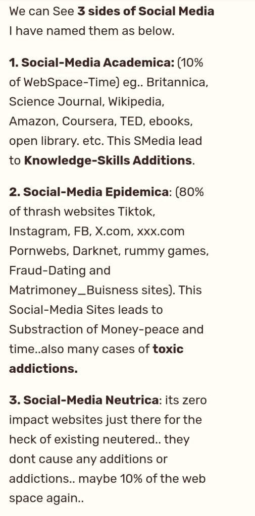1. Social-Media Academica(+ve): Sad-e’sangha (personal guestimate 10% of WebSpace-Time) eg.. Britannica, Science Journal, LinkedIn, Wikipedia, Amazon, Coursera, TED, ebooks, open library. etc. This SMedia lead to Knowledge-Skills Additions.