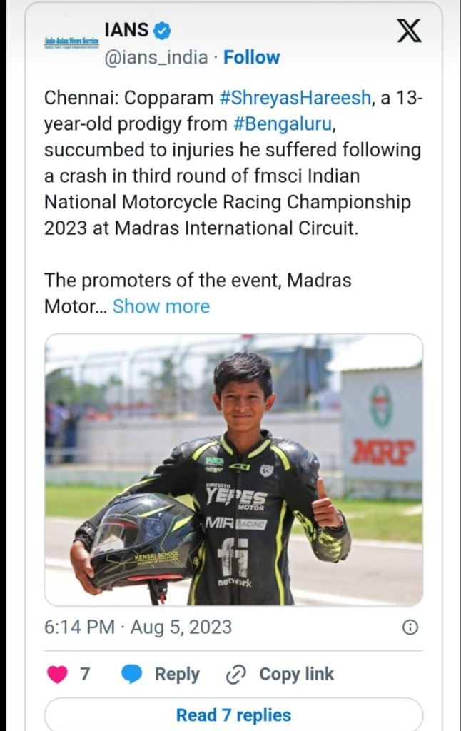 Manipulated to be a Prodigy or Prodded- Jeevi.. a creation of unsafe parenting & exploitative organisers. How did they allow a 13year old to compete in a risky car race when driving license is given at 18years https://www.timesnownews.com/sports/13-year-old-racing-prodigy-shreyas-hareesh-dies-in-crash-at-cheenai-circuit-article-102458731