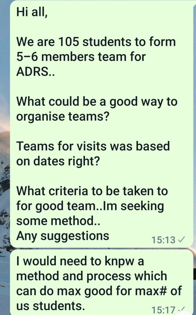 1. Class Challenge_Problem: In a Course/Class there was a grouping task, We have total student strength of 105 members. Teachers posted a group task(Simulation Skit) & assignment (Record_Report) for 2 of 5 problems, Condition was team can be of 5-7 members. Our Individual & collective Team Efforts will get us each upto 40 of total 100 marks. Q: How to form good groups_Team that can perform well and achieve good outcomes marks for all team members.