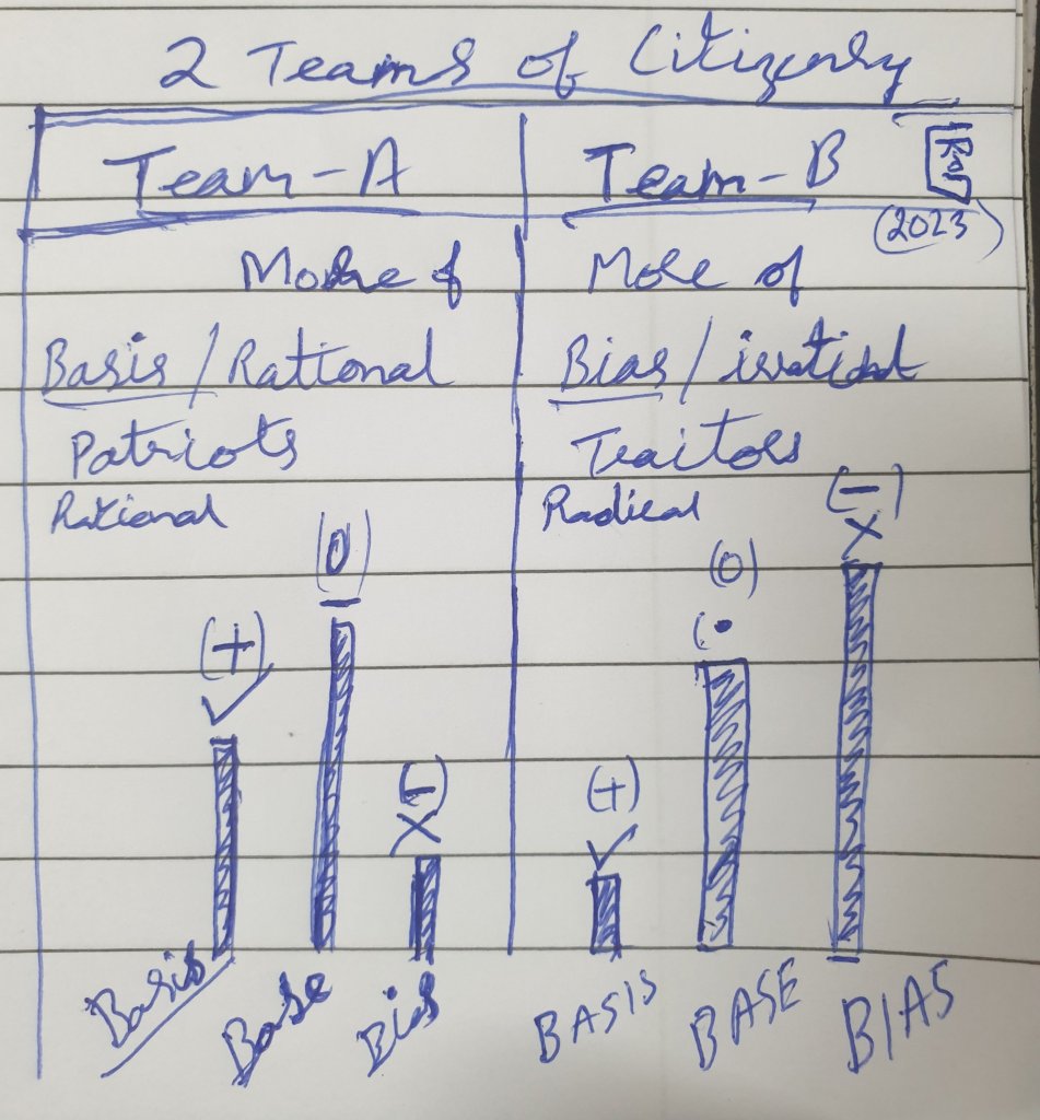 Rationo_Ethical Human Value Based “India_Team A” Vs the Irrational_Immoral material value biased India_Team Rather India Gang_B. Altruistic-India (India A_Team) Vs Biasistic_India (India B_Team). The Rational_India Vs the Radical_India.
