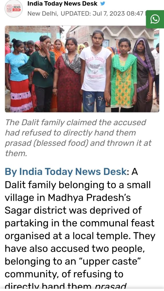 Classte atrocity in North India: https://www.indiatoday.in/india/story/threw-prasad-at-us-dalit-family-denied-seating-satna-madhya-pradesh-temple-feast-case-lodged-2403064-2023-07-07