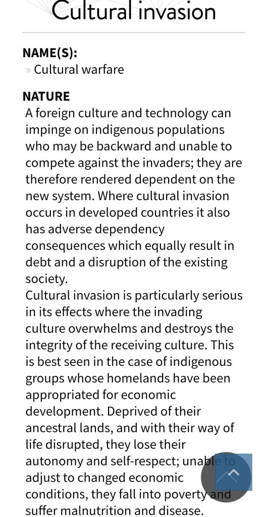 Cultural-Invasions of the I indigenous and Natives instead of cultural Harmonious Assimilation. Implementation by force or coercion Vs Adoption and adaptation by choice and consent.
