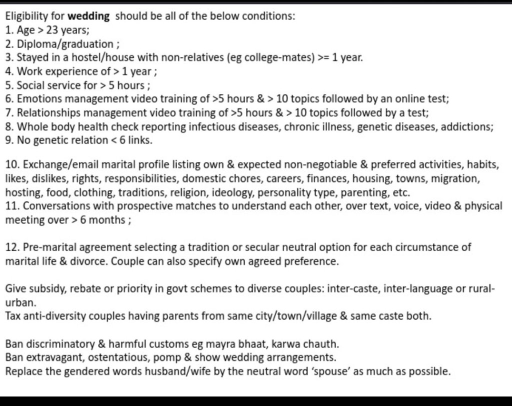 A pre-marital agreement should be mandated to be filled & signed by each couple before wedding. A detailed list will bring clarity & mutual understanding of each other’s expectations, wishes, preferences, rights, responsibilities, spending style, parenting approach & plans for a married life as well as how to handle divorce.
