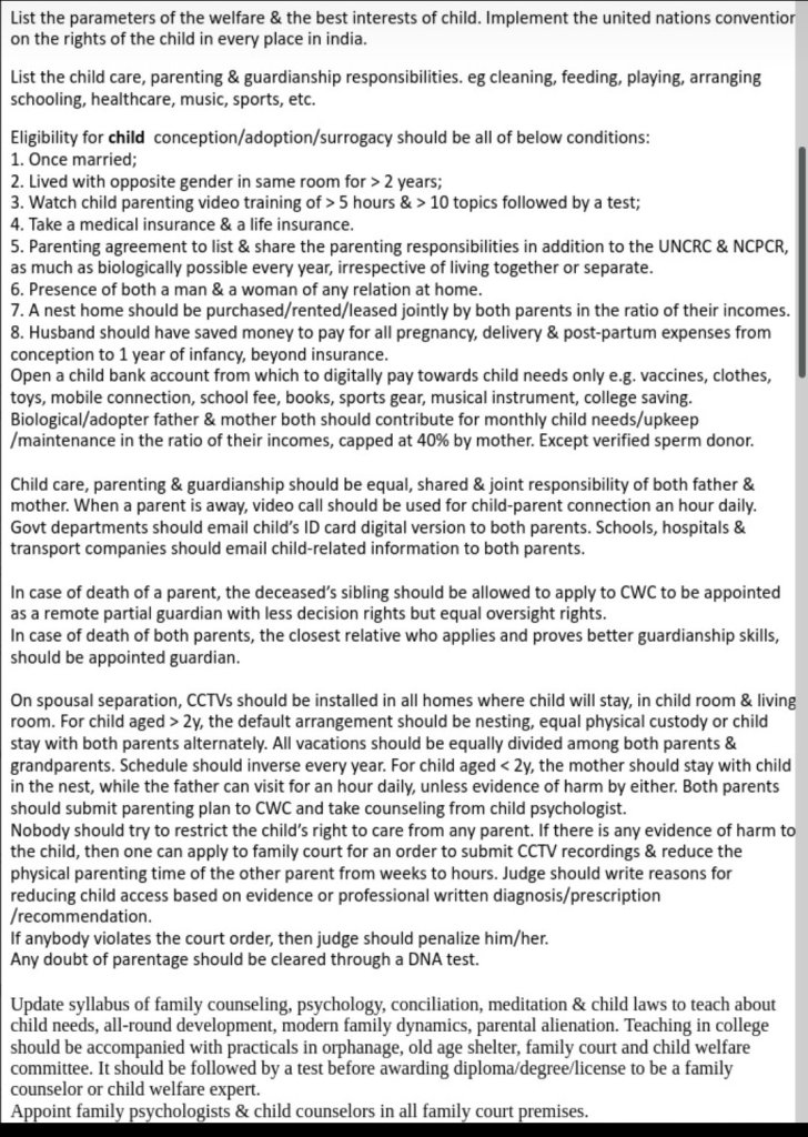 Stop incentives to make false Child abuse allegations and POCSO as tactics: It is being seen that some mothers file POCSO case or similar sexual abuse of child allegations on father just to gain advantage in child custody case, or to deny custody altogether to father. This is a highly deplorable practice. If general laws are not sufficient, then a special provision should be added to laws that any parent making such false allegations of child sexual abuse or any other form of child abuse will stand to get reduced custody and guardianship, and even lose custody rights altogether in severe cases.