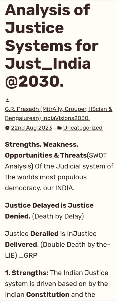 This SWOT-Analysis of Indian Legal System Reveals there are lot of deep root causes to the problems in Indian Legal system which is making 1. common civilized citizens to stay away from raising concern on violation of their human rights.