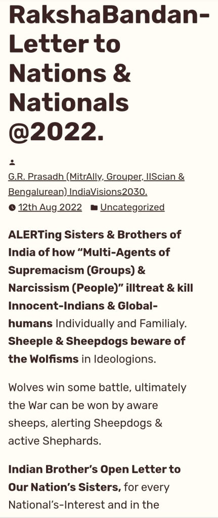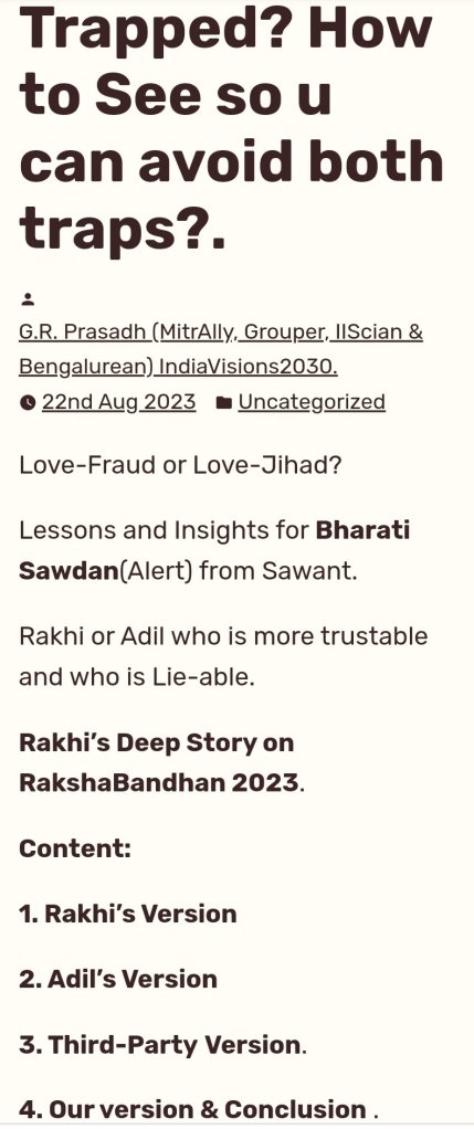This Real Story between Mumbai (Hurtage-City) & Mysore (Heritage-City) will Reaveal a Lot of Insights for life. Do read or if unaware anyone may be trapped like them both too. Awareness is first step of Prevention. https://grpvcare2dare.design.blog/2023/08/22/s344-rakhi-adil-needed-to-read-rakshabandhan-safety-letter-money-trap-female-target-or-honey-trap-male-target/