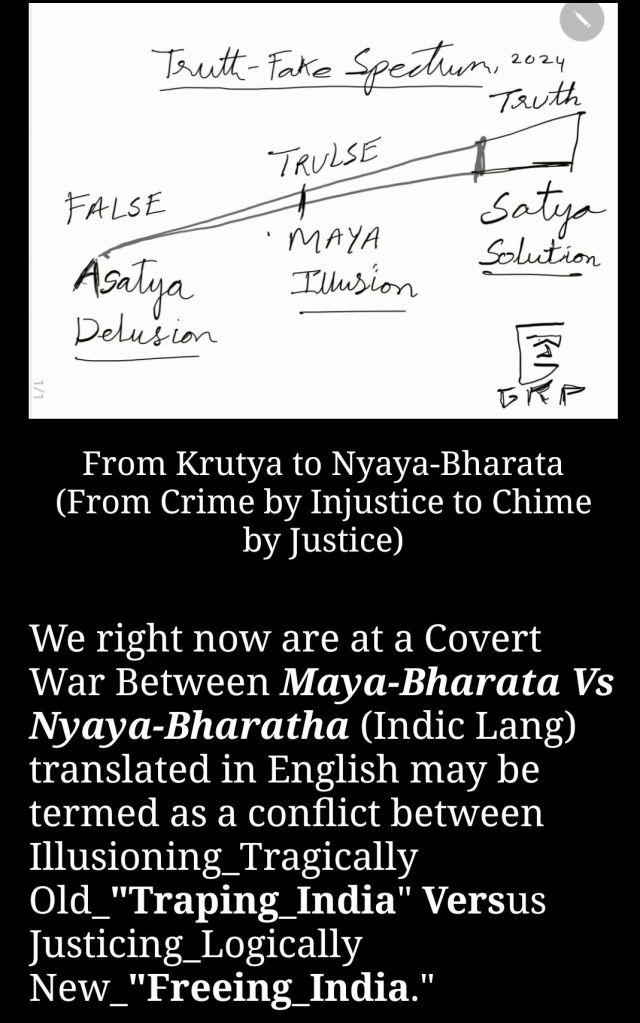 We right now are at a Covert War Between Maya-Bharata Vs Nyaya-Bharatha (Indic Lang) translated in English may be termed as a conflict between Illusioning_Tragically Old_“Traping_India” Versus Justicing_Logically New_“Freeing_India.”
