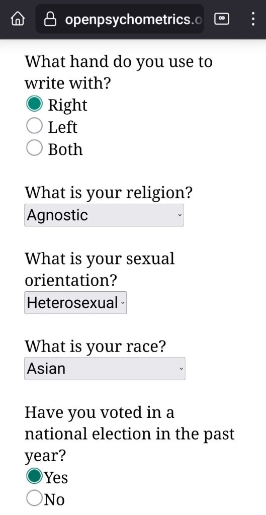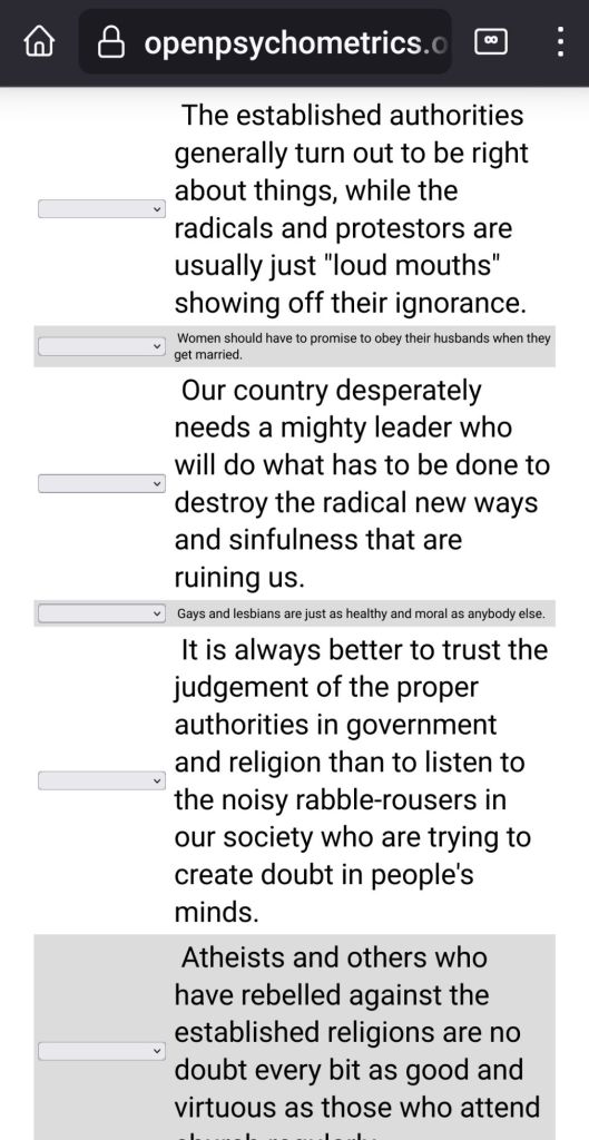 Key to the Mystery: This is a test that shows whether and how much on a scale “WE are Right Wing or Left Wing Authoritarians:” and this reflects our Mindset and Behaviour in Society. Link to Test: (https://openpsychometrics.org/tests/RWAS/1.php)