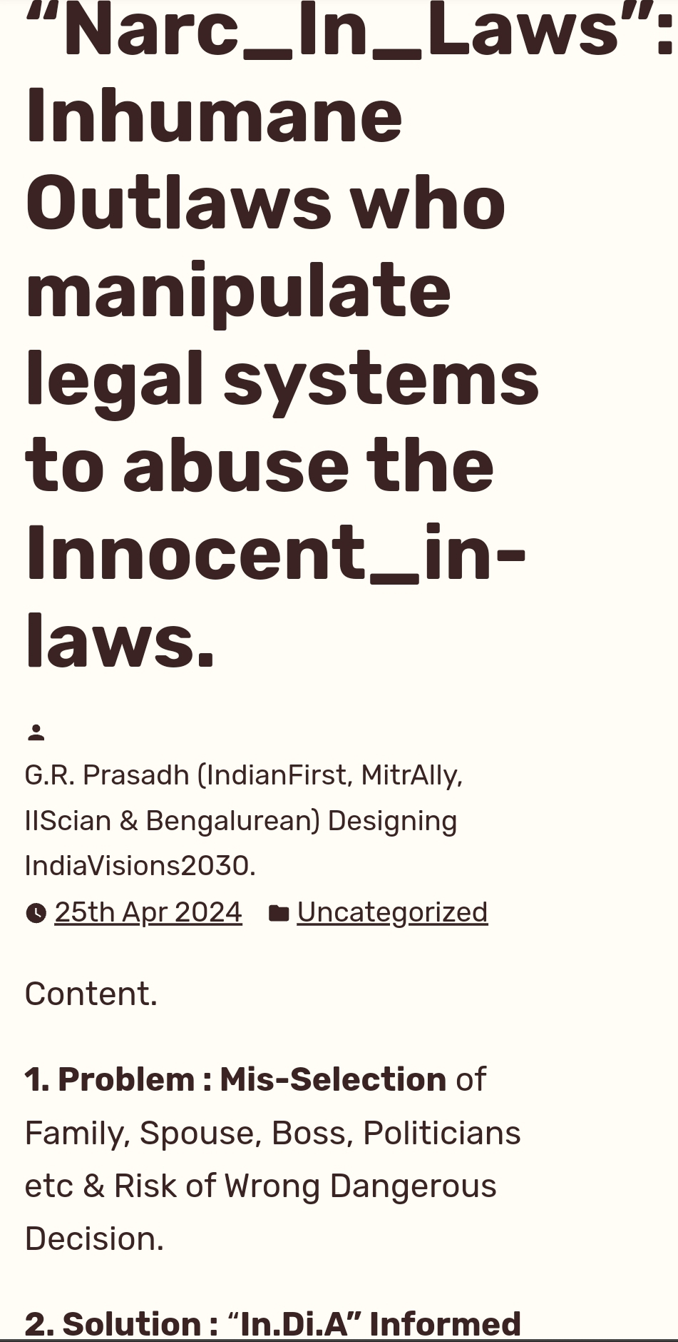 Content. 1. Problem : Mis-Selection of Family, Spouse, Boss, Partners, Politicians.. etc & Risk of Wrong Dangerous Decisions. 2. Solution : “In.Di.A” Informed Right_Selection Method. People who have been Maritally-frauded and cheated by false _Relational_Fakers know what is Narc_Abuse in Relationships especially in marriage partnerships. Oppressions & Victimization is also Gender Neutral, Empathic Global Human … Continue reading S432: “Narc_In_Laws”: Inhumane Outlaws who manipulate legal systems to abuse the Innocent_in-laws.