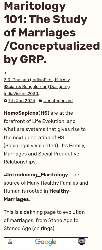 One can see for themselves. If Study of Biotics(Life) is Biology and Study of Neurons is Neurology.. Then Where is the Body of Knowledge related to ‘Maritology‘ (Study of Marriages) ? Do Google the Word or the description to see the reality below. there seems more interest in the basics or fundamentals of materials I.e atomic fission.. but less in the basics of human-sciences of family fusions. this is why there is a massive knowledge gap that may be cause for the chaos in society of unhealthy family systems failures. this needs awareness for Transformations.