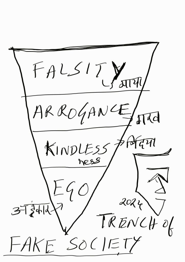 F.A.K.E= more Falsity (Maya-Agyan), Aggressive-Arrogance (Garva), Kindlessness (Nirdaya), Ego (Ahanakara).