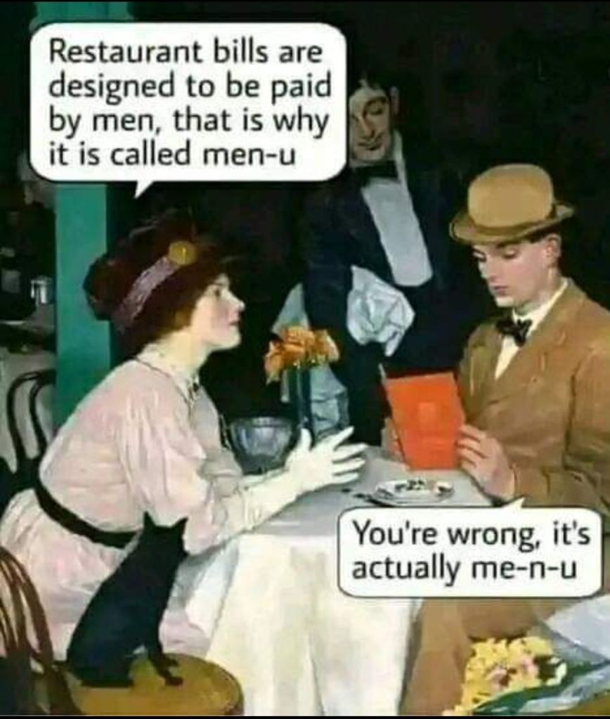 Above Image highlights: Gender Dynamics in finances. gender role expectations or presumptions is one gender pays at table “Men-u pay“.. the other is equality at pay.. “me N u” both pay for menu.