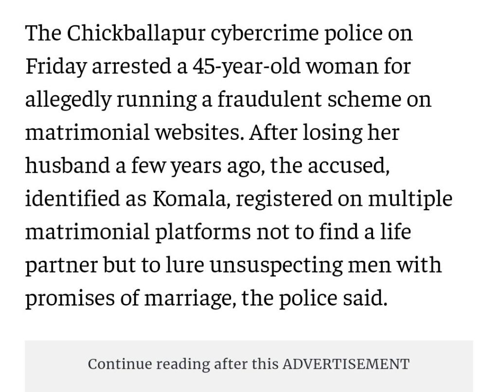 Chickballapur.. Ironical name for the diabolical game of Narc-apps. Dont Make Blunder on Tinder or Stumble on Bumble.. Beware of Crap Apps that target men and women for their property & slavery. https://www.thehindu.com/news/cities/bangalore/chickballapur-cybercrime-police-arrest-woman-for-cheating-people-on-matrimonial-sites/article68589701.ece *#Indian_huMANitarians Group Fraternizing Our Brotherly_India 💙🇮🇳2030:* Developing our Next_Gen Tonic_GendersSense & Neo_IndianFamilies4.0.https://chat.whatsapp.com/KecJokbFlP4F0azMaCyeyA