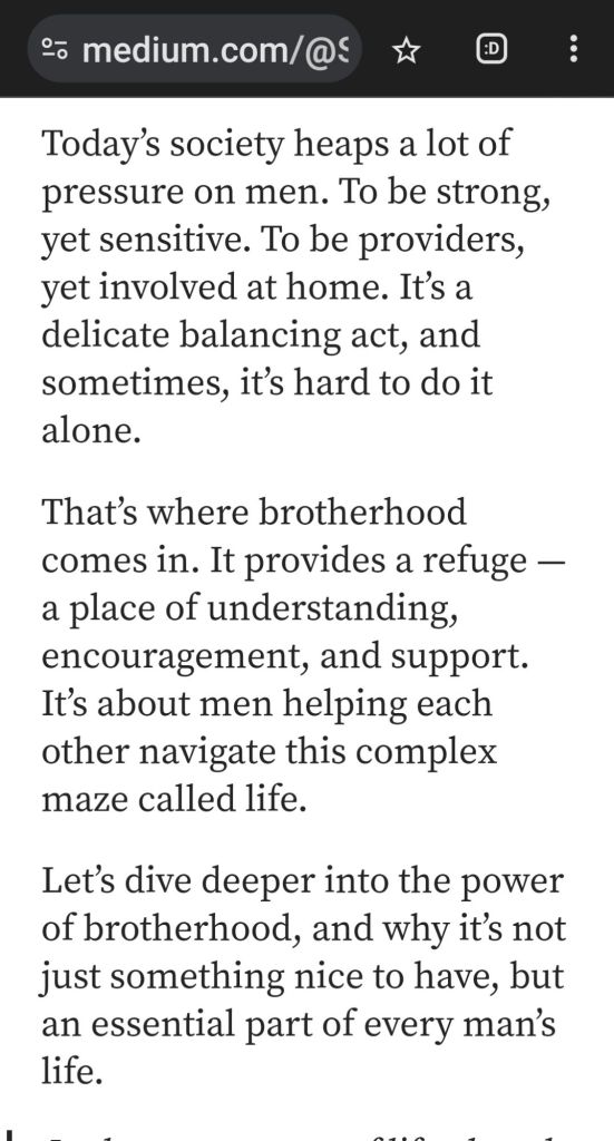 [08/10, 10:28] G.R.P )= G.R.Prasahd (=Grit+ReaSon+Peers). Mission 2024: I see that many of our Indian brothers are Uninformed, Misinformed & worse Ill-informed. without a brothers Support system. due to which they lead a vulnerable life and with risky futures, I propose to form a dedicated healthy brotherhood for Community development with peer support.. How many of young men may need this MENtouring community can let me know.. Brothers without Borders..