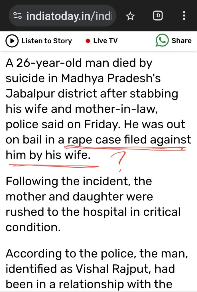 How legal Mis-interventions lead to Mis-adventures.. https://www.indiatoday.in/india/story/madhya-pradesh-jabalpur-man-out-on-bail-kills-wife-mother-in-law-after-rape-case-2619587-2024-10-19?utm_source=Taboola&utm_medium=organic&utm_campaign=recirculation