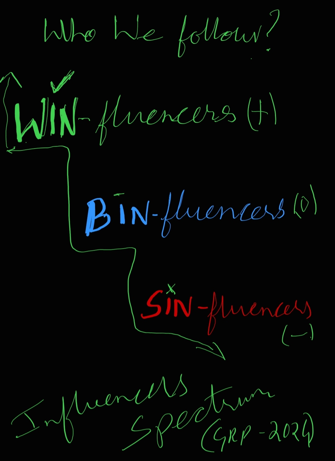 2. Bin-fluencers: Influence more win-loss for One Party over others losses. Zero sum game. Competitive & Exploitative gamers. “I Win & U loose”. Scarcity & Fixed Mindsets. Crab-Mentality. Me-happy, You-I dont care. More Lawlessness & more Flaws in Society.