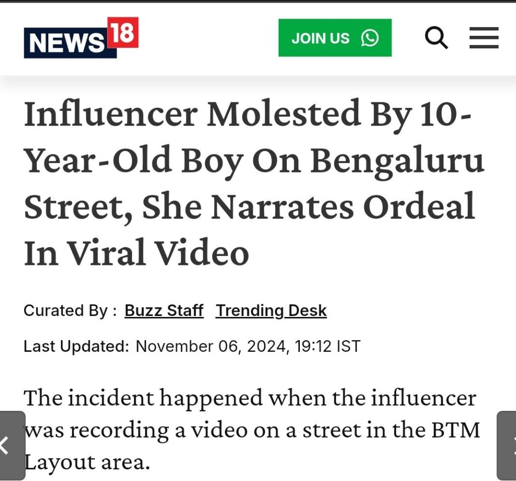 Unhealthy Genderity Kids minds being spoilt #SaveIndianMinds: https://www.news18.com/viral/influencer-molested-by-10-year-old-boy-on-bengaluru-street-she-narrates-ordeal-in-viral-video-9111480.html