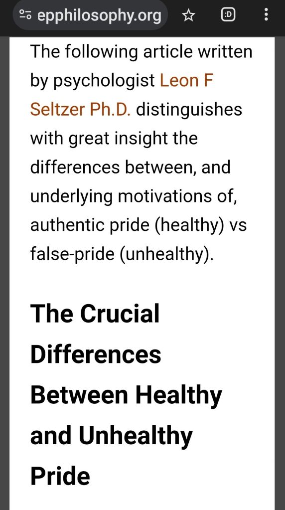 False Pride wordings: I am Proud of my Bank Balance and large house. I am proud that I cheated & hurt that guy. You be proud of me that you are my daughter, go and kick all mens asses (Misandric Gender-pride). Linked to materials & peoples in life or literature.