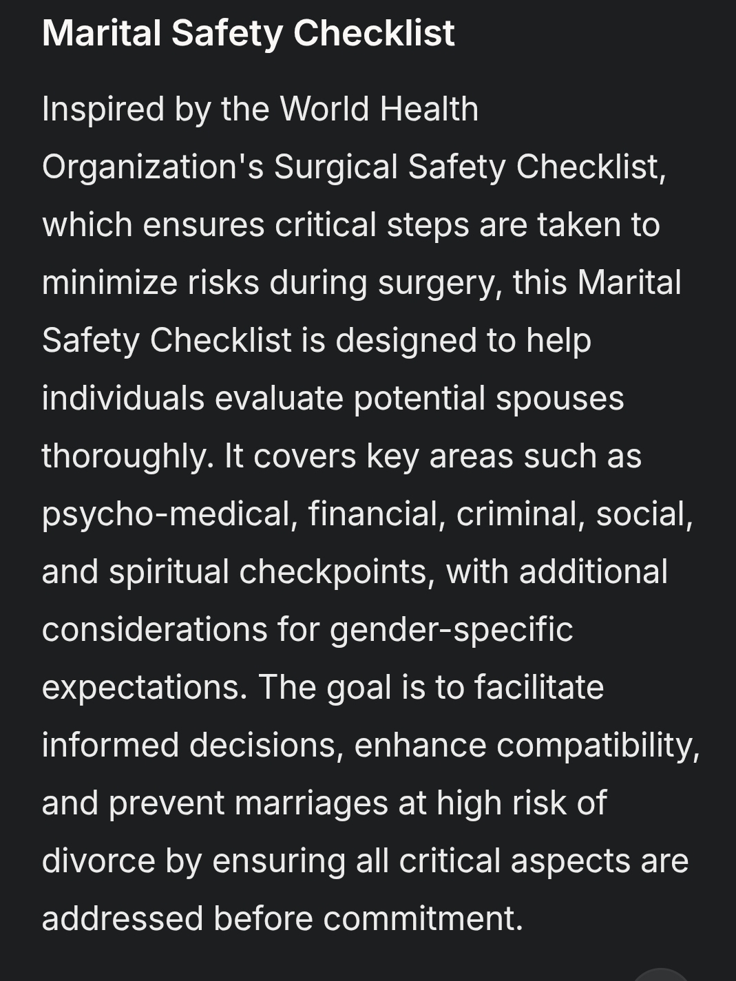 Inspired by the World Health Organization’s Surgical Safety Checklist, which ensures critical steps are taken to minimize risks during surgery, this Marital Safety Checklist is designed to help individuals evaluate potential spouses thoroughly. It covers key areas such as psycho-medical, financial, criminal, social, and spiritual checkpoints, with additional considerations for gender-specific expectations. The goal is to facilitate informed decisions, enhance compatibility, and prevent marriages at high risk of divorce by ensuring all critical aspects are addressed before commitment.