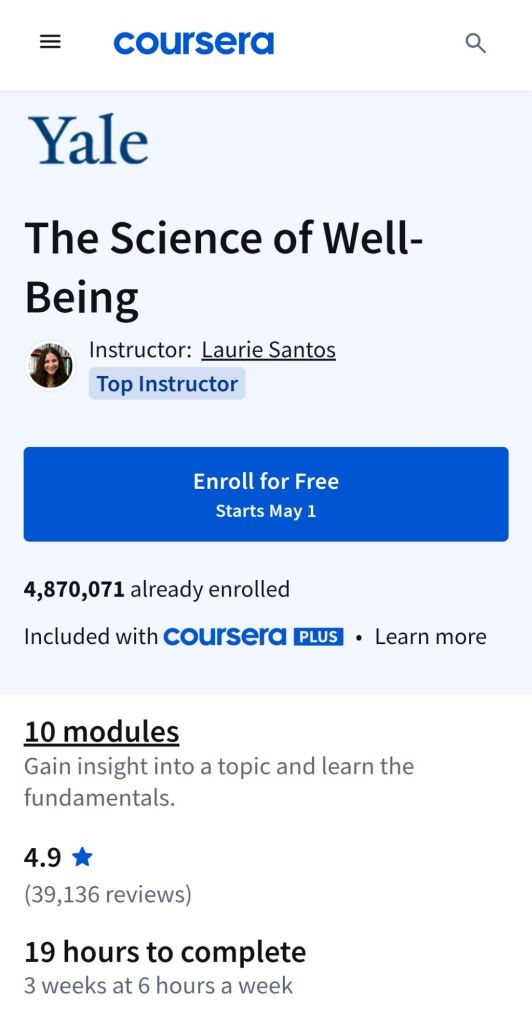 - Coursera Access: Enroll in The Science of Well-Being (free to audit, ~$49 for certificate) and The Science of Well-Being for Teens (also free to audit). Both are on Coursera’s platform.