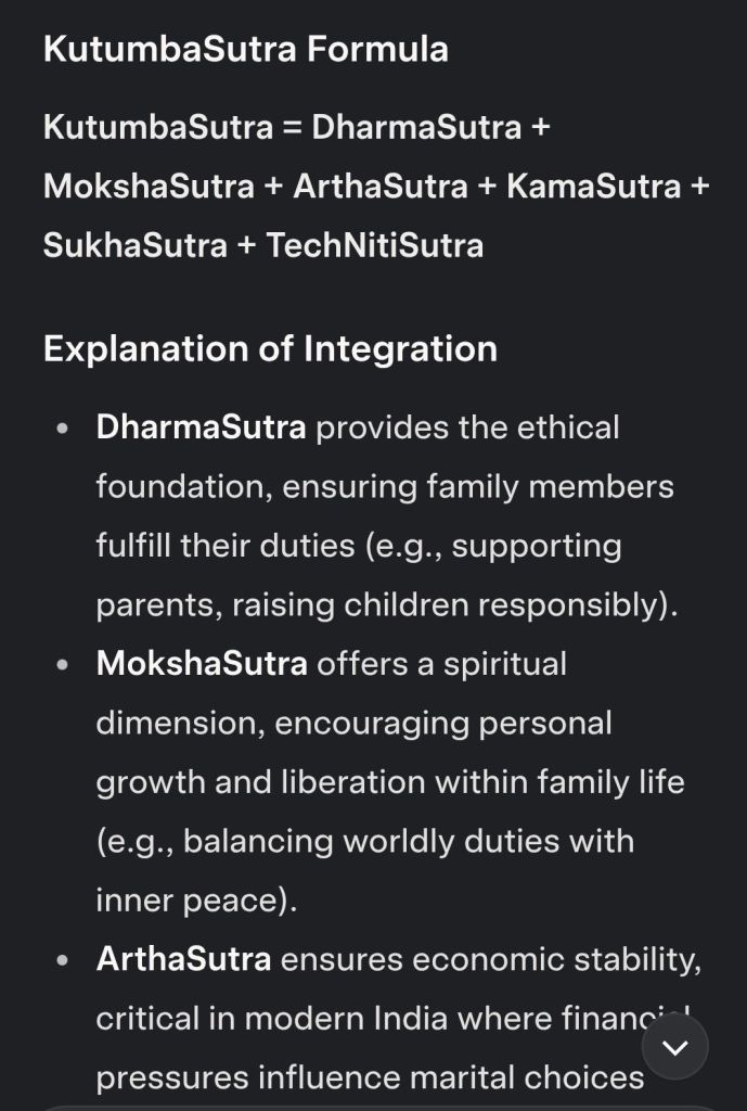The concept of KutumbaSutra as a synthesis of traditional Indian philosophical and ethical frameworks offers an intriguing way to blend family life with spiritual and moral principles. Drawing from your earlier discussions about bachelorhood, family dynamics, and societal roles in India, we can interpret KutumbaSutra as a holistic guide for family living, integrating DharmaSutra (duties and righteousness), MokshaSutra (liberation and spiritual freedom), and additional sutras to address practical, emotional, and modern challenges. Let’s define it and propose complementary elements.