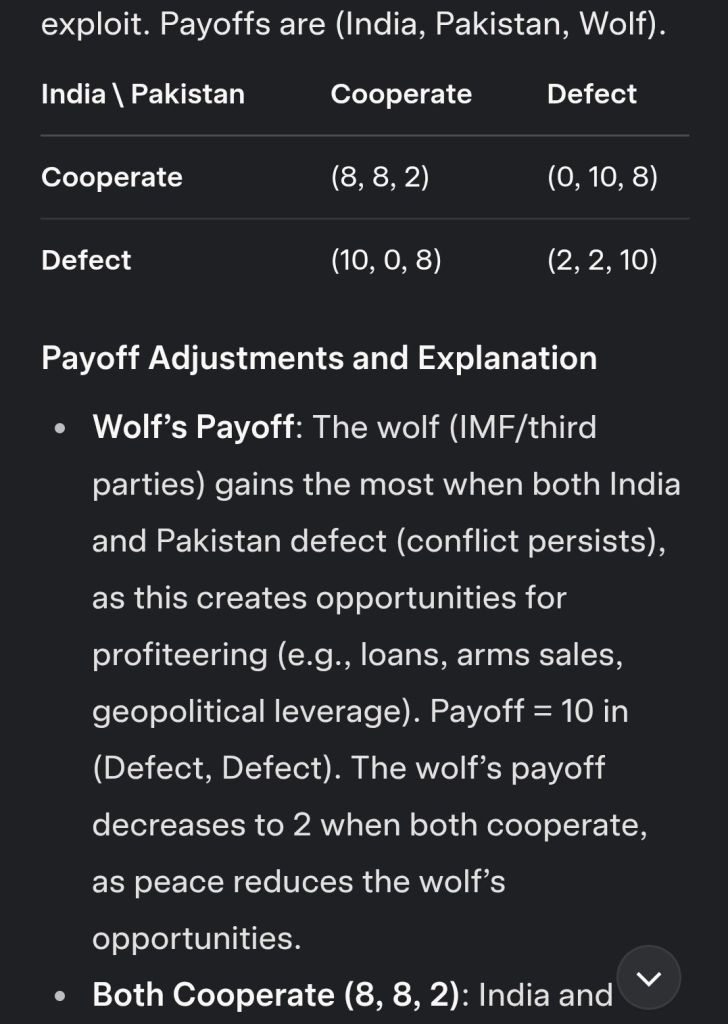 - Both Defect (2, 2, 10): The current stalemate—ceasefire violations, militancy, and distrust—hurts both India and Pakistan, but the wolf maximizes its payoff (10) by fueling the conflict through financial mechanisms (e.g., IMF loans to Pakistan) or geopolitical maneuvers.