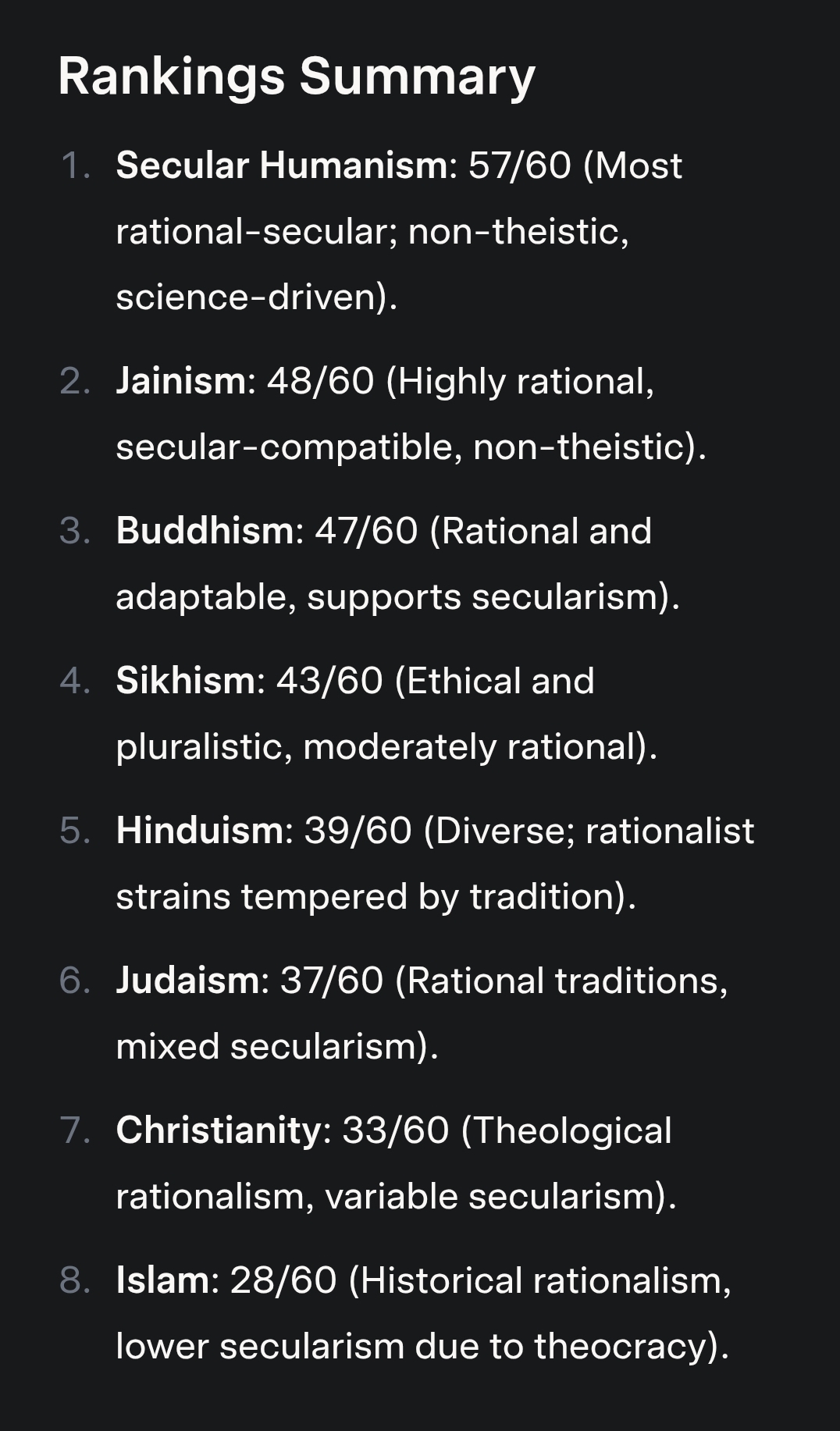 The RRR ranks secular humanism highest due to its explicit rejection of supernatural claims and alignment with scientific rationalism and secular governance. Jainism and Buddhism follow, benefiting from non-theistic rationalism and compatibility with India’s secular democracy, as championed by Ambedkar (a key figure in your prior query). Sikhism and Hinduism score moderately, reflecting ethical egalitarianism and India’s pluralistic ethos, though Hinduism’s caste legacy lowers its rationality. Judaism and Christianity balance rational theological traditions with faith-based constraints, while Islam ranks lowest due to contemporary literalism and theocratic tendencies in OIC states like Pakistan, which your queries critique for anti-India bias.