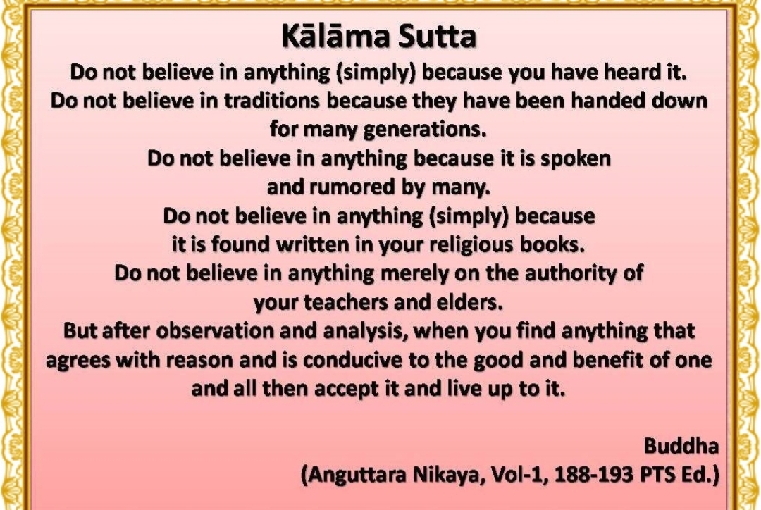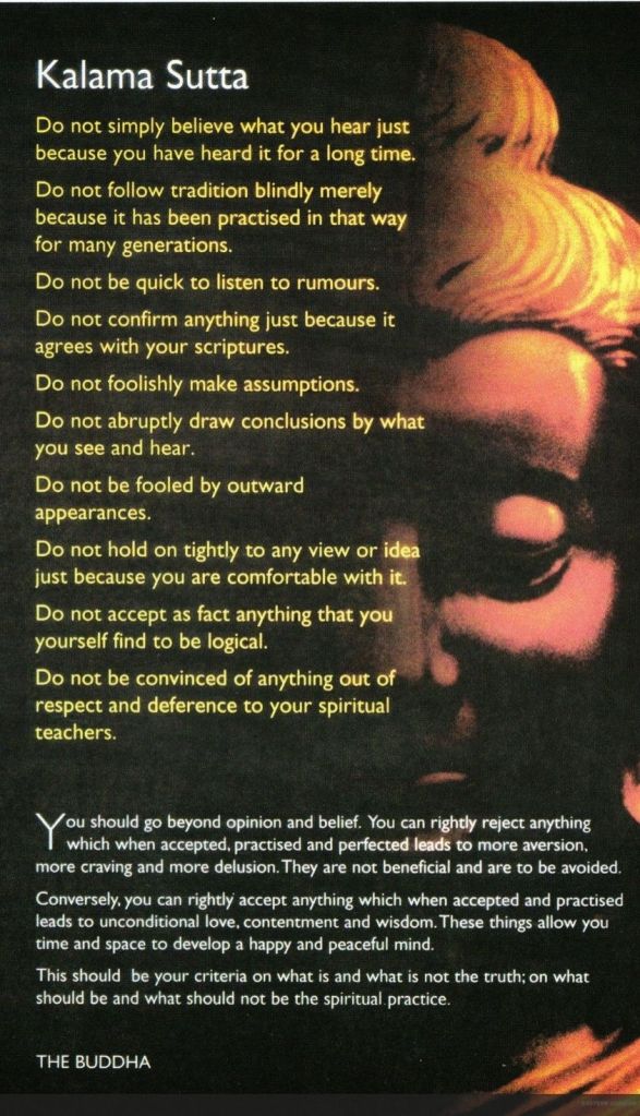 “Do not go by reports, by legends, by traditions, by scripture, by logical conjecture, by inference, by analogies, by agreement through pondering views, by probability, or by the thought, ‘This teacher is our guru.’