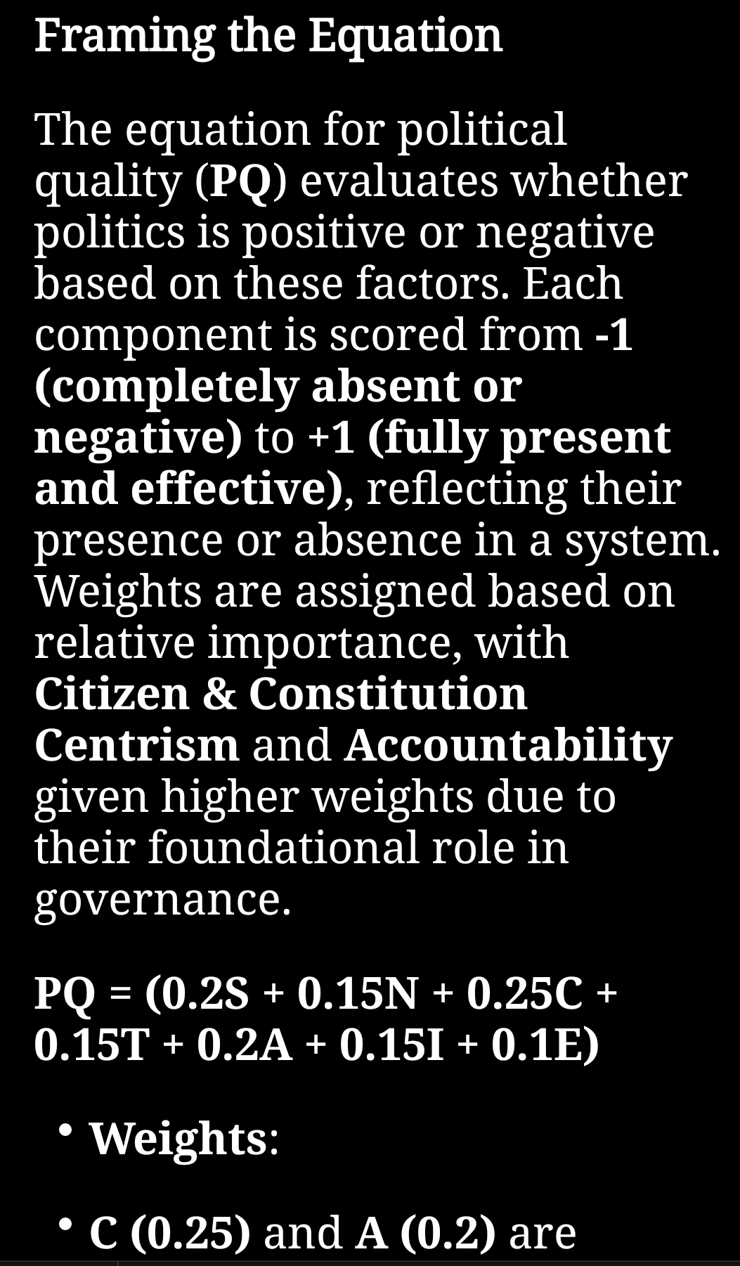 The equation for political quality (PQ) evaluates whether politics is positive or negative based on these factors. Each component is scored from -1 (completely absent or negative) to +1 (fully present and effective), reflecting their presence or absence in a system. Weights are assigned based on relative importance, with Citizen & Constitution Centrism and Accountability given higher weights due to their foundational role in governance.