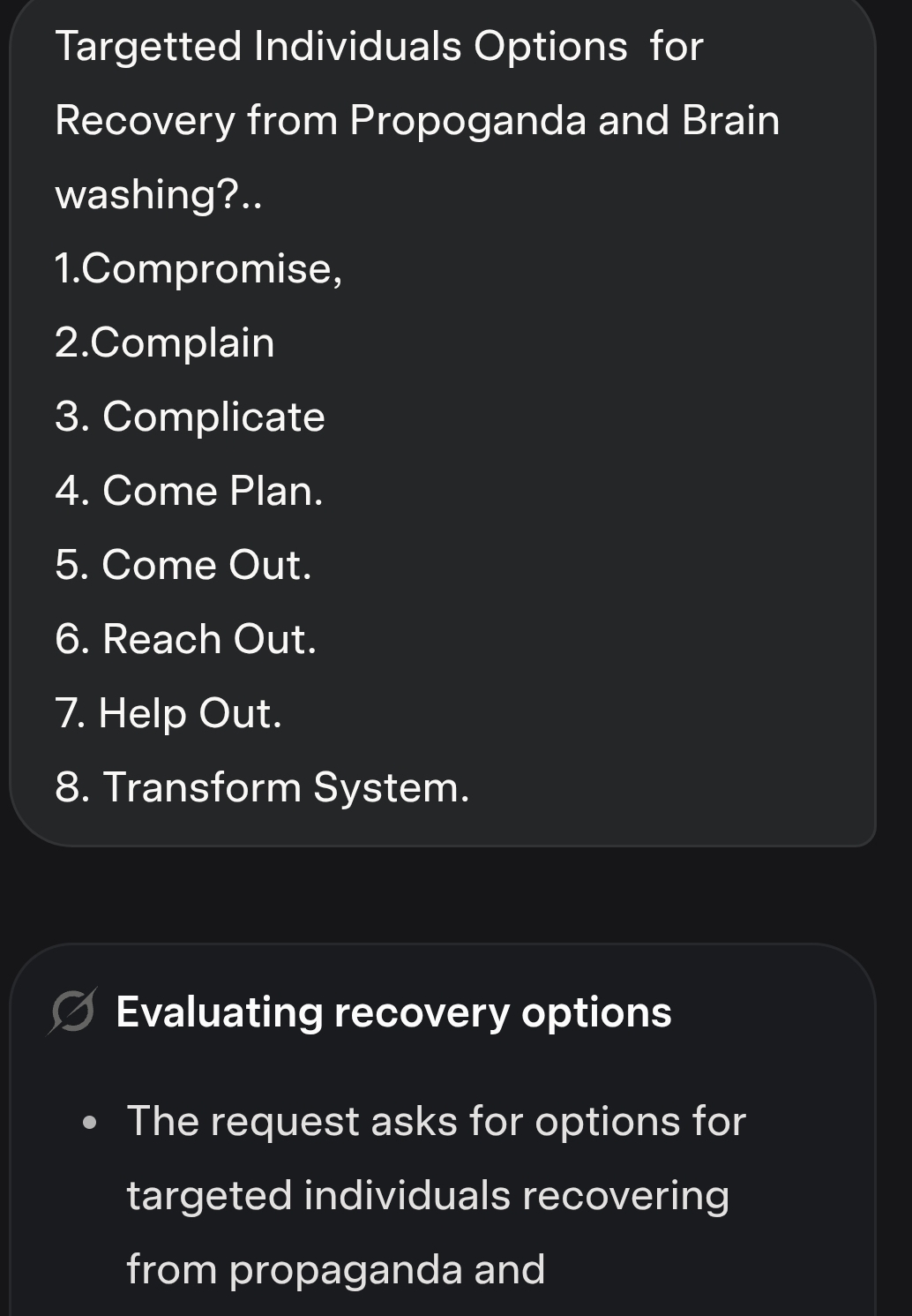 Recovery Options for Targeted Individuals: Overcoming Propaganda and Brainwashing Targeted individuals (TIs)—those who perceive themselves as subjects of systematic propaganda, ideological subversion, or psychological manipulation—face unique challenges in reclaiming autonomy. Whether stemming from cultural globalization, media influence, or perceived organized campaigns, recovery involves dismantling ingrained beliefs and rebuilding resilience. Drawing from psychological insights on deprogramming,Continue reading “S1342: From Trap to Transformation. Path for T.Is..”