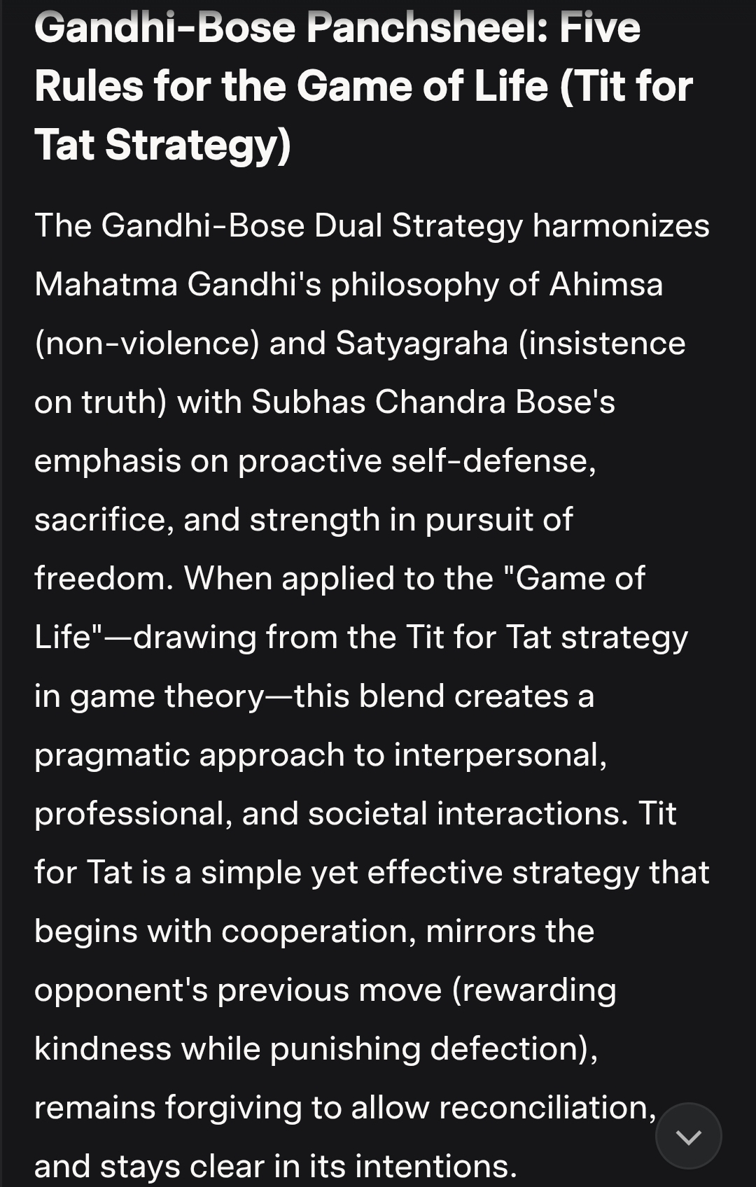 Gandhi-Bose Panchsheel: Five Rules for the Game of Life (Tit for Tat Strategy) The Gandhi-Bose Dual Strategy harmonizes Mahatma Gandhi’s philosophy of Ahimsa (non-violence) and Satyagraha (insistence on truth) with Subhas Chandra Bose’s emphasis on proactive self-defense, sacrifice, and strength in pursuit of freedom. When applied to the “Game of Life”—drawing from the Tit forContinue reading “S1332: Gandhi-Bose Strategy for Game of Life. For Intra & International GeoPolitics.”