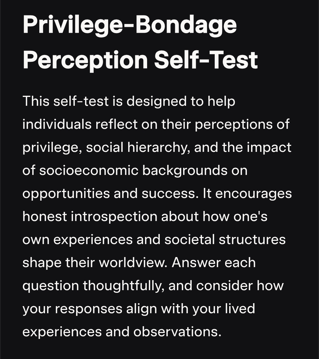 Privilege-Bondage Perception Self-Test This self-test is designed to help individuals reflect on their perceptions of privilege, social hierarchy, and the impact of socioeconomic backgrounds on opportunities and success. It encourages honest introspection about how one’s own experiences and societal structures shape their worldview. Answer each question thoughtfully, and consider how your responses align with yourContinue reading “S1322: Privilege-Poverty Mirror Test. GRP&Grok”