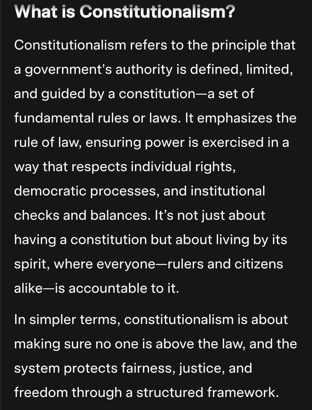 What is Constitutionalism? Constitutionalism refers to the principle that a government’s authority is defined, limited, and guided by a constitution—a set of fundamental rules or laws. It emphasizes the rule of law, ensuring power is exercised in a way that respects individual rights, democratic processes, and institutional checks and balances. It’s not just about havingContinue reading “S1262: Whats Constitutionalism and “Any-ism”..? /GRP+Grok”