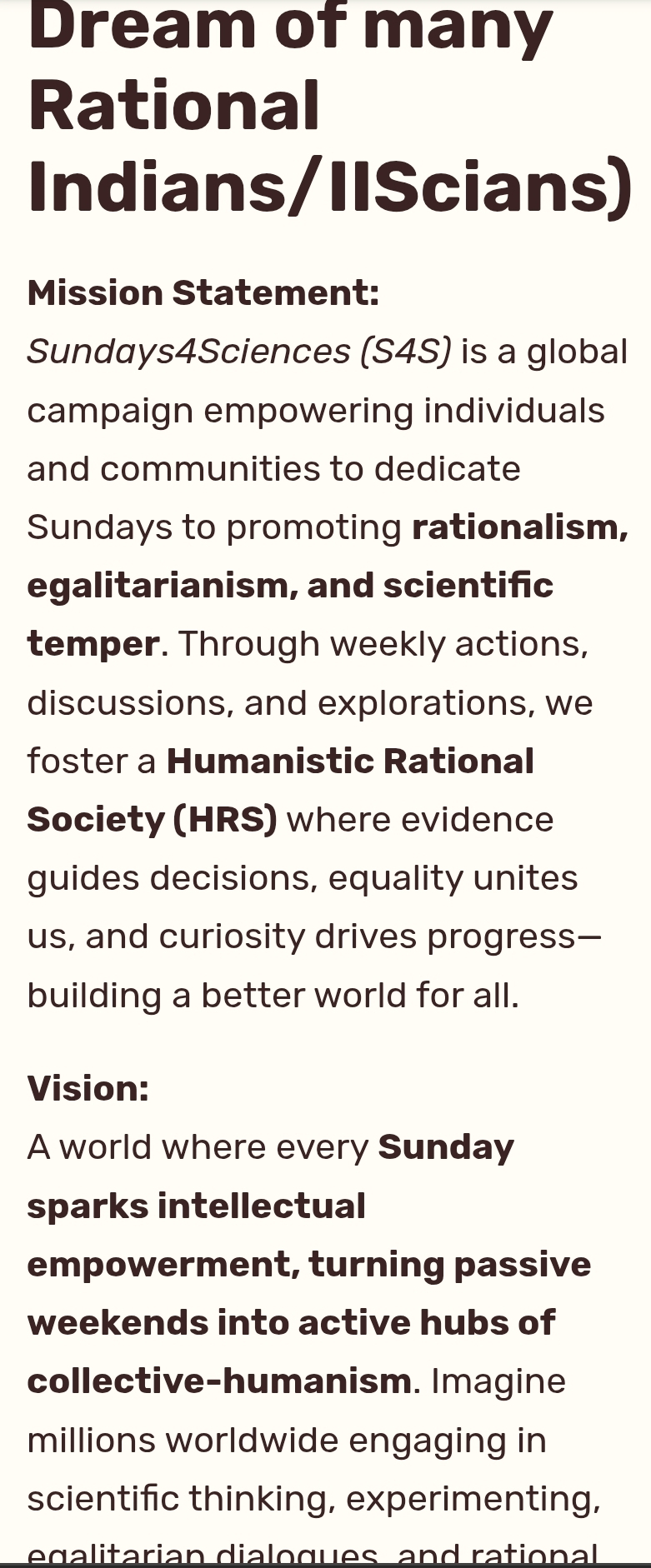 Campaign PReview: Sundays4Sciences (S4S) – Global Humanists Campaign for Intellectual Empowerment through Collective-Humanism. Launched in India Freedom Week 2025 for Freedom from Superstitions, Bias, Elitism and Prejudice with Peoples Sciences. GROKs Appreciation to Campaign: What a brilliant and timely idea! Drawing inspiration from religious observance days, where communities dedicate specific times to reflection and values,Continue reading “S1229: “Sundays4Sciences” S4S is an initiative of an IIScian for Socializing Sciences.”