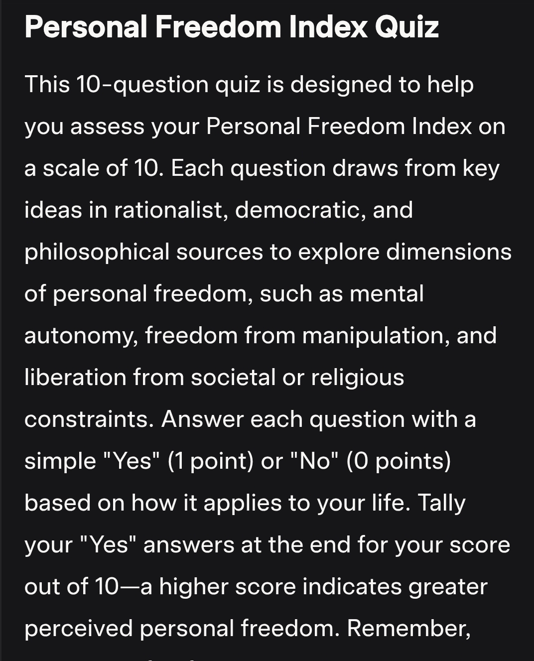 My Freedom Test. https://grok.com/share/bGVnYWN5LWNvcHk%3D_35ca058a-ea37-4173-ac49-b821b25e06d0 Universal Personal Freedom Index Quiz: This 10-question quiz is designed to help you assess your Personal Freedom Index on a scale of 10. Each question draws from key ideas in rationalist, democratic, and philosophical sources to explore dimensions of personal freedom, such as mental autonomy, freedom from manipulation, and liberation fromContinue reading “S1231: Check Your Freedom Index on Scale of 1-10.”